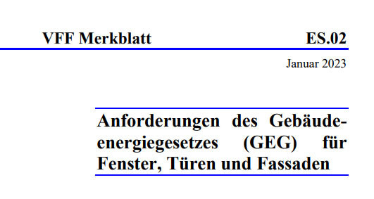 Der Verband Fenster + Fassade (VFF) hat das VFF-Merkblatt ES.02: 2023-01 „Anforderungen des Gebäudeenergiegesetzes (GEG) für Fenster, Türen und Fassaden“ in Zusammenarbeit mit dem Ingenieurbüro Prof. Dr. Hauser GmbH (IBH) und weiteren Organisationen überarbeitet und durch die Kompetenzgruppe des Technischen Ausschusses des VFF zur Veröffentlichung freigegeben.