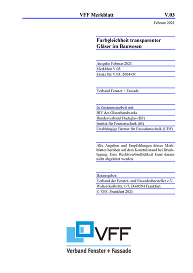 Das VFF-Merkblatt V.03: 2021-02 „Farbgleichheit transparenter Gläser im Bauwesen“ ist als Leseprobe unter www.window.de im VFF-Bereich „Publikationen / Shop“ unter „VFF-Merkblätter – materialspezifische Themen“ in Auszügen einzusehen. Das Merkblatt kann in gedruckter Form oder als PDF bei Beuth unter www.beuth.de (dann bei Suche „V.03“ eingeben, komplettiert sich automatisch) bestellt werden. Die Schutzgebühr beträgt 15,- Euro. Mitglieder des VFF erhalten je ein Exemplar kostenlos.