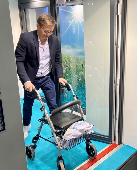 Und davon konnten sich die Messebesucher und auch die GW-Redaktion selbst ein Bild machen. Fazit: Manch eine(r) hatte ganz schön zu kämpfen, die Räder des Rollstuhls über die 1 cm-Schwelle zu bugsieren: Christian Rager von ALUMAT gibt am Stand zu bedenken, „muss man sich jetzt nur noch vorstellen, man habe ein Tablett mit dem heißen Frühstückskaffee auf den Oberschenkeln und will über die 1 cm-Schwelle auf die Terrasse.“ Allzu viel Fantasie ist nicht vonnöten, um sich ein Bild vom Ergebnis zu machen.