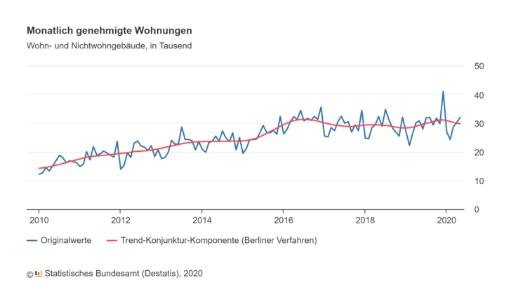 In den Monaten Januar bis Mai 2020 stieg die Zahl der genehmigten Wohnungen in Wohn- und Nichtwohngebäuden um 4,2 % gegenüber dem entsprechenden Vorjahreszeitraum an.