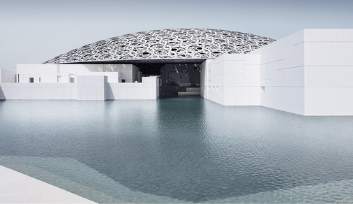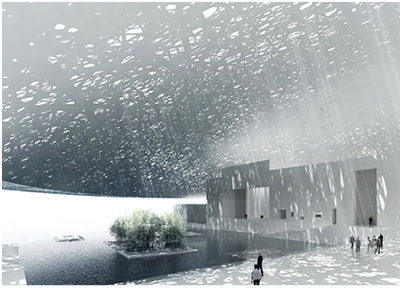 _ Beim Entwurf des Louvre von Abu Dhabi ließ sich Architekt Jean Nouvel von der Stadt Medina und typischen arabischen Siedlungen inspirieren. Es entstand eine Art Museumsstadt im Meer, geformt aus 55 weißen Gebäuden, die eine riesige stählerne Kuppel zu einer Einheit zusammenfasst. Die Kuppel besteht aus acht Schichten von Stahlornamenten, die ein sternförmiges Gitter bilden. Diese filtern das Licht wie ein Blätterwerk, lassen Helligkeit herein und schützen doch vor Hitze und Sonne. Architekt Jean Nouvel spricht von einem „Lichtregen“, der unter der Kuppel entsteht, einzelne Bereiche hervorhebt und andere nur erahnen lässt.