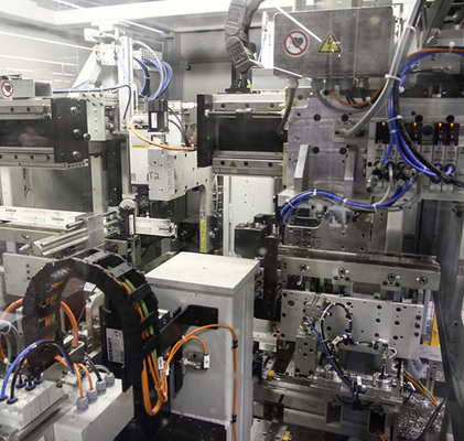 Am Beschlagsautomaten werden Dübelbohrungen und Schlosskastenfräsungen für Haustüren gemacht und auf einer weiteren Strecke erfolgt die komplette Montage der Winkhaus-Beschläge. Dort werden diese vollautomatisch am losen Stab montiert – eine Symbiose aus Beschlagssystem, Profilsystem und Maschinentechnik.