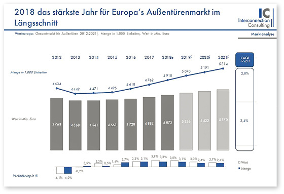 2018 wird der Markt für Außentüren in Westeuropa so stark wachsen, wie schon lange nicht mehr. Mit einem Plus von fast 4 % in Wert erreicht das Wachstum 2017/18 dann aber auch seinen Zenit für die nächsten Jahre.