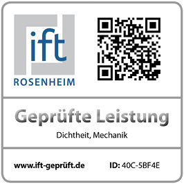 Das „ift-geprüft“-Zeichen ist ein geschütztes Warenzeichen und „Echtheitsindikator“ mit QR-Code und ID-Nummer, das einfach auf die herstellerunabhängige Website „ www.ift-geprueft.de“ führt. Hier sind die zugehörigen ift-Nachweise für das geprüfte Produkt mit Infos zu technischen Kennwerten/Produkteigenschaften, Verwendung sowie geltenden Normen und Prüfkriterien verfügbar.
