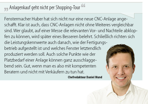 Martin Kenntner von Leitz meint abschließend: „Den Trend, dass kleinere Fensterhersteller ihre Produktion aufgeben und zum Händler mutieren, sehen wir nicht.” Denn am Beispiel der Firma Huber werde deutlich: Zahlungskräftige Kunden verlangen Handwerker, die beste Qualität und individuelle Lösungen anbieten können. Und der Fensterhersteller selbst scheint sich auf die Anlage und die Umstellungen nicht nur gut vorbereitet zu haben, er sieht auch der Zukunft gelassen entgegen und sagt: „Mit dieser Maschine möchte ich alt werden.“—
