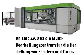 Der Anlagenbauer Biesse hat seinen Stammsitz in Pesaro/Italien. In Deutschland gibt es die Vertriebsniederlassungen in Elchingen und Löhne. Hier werden auch die Ersatzteilversorgung sowie der gesamte Servicebereich koordiniert. Das neue UniLine-Bearbeitungszentrum sei in der DACH-Region bislang 10-mal ausgeliefert worden, so Markus Süß. Die Anlage sei geeignet für kleine und mittelständische Betriebe. Die Maschine benötige nur ein paar Quadratmeter und produziere Standard- und Sonderfenster, während der Bediener andere Arbeiten durchführen könne.