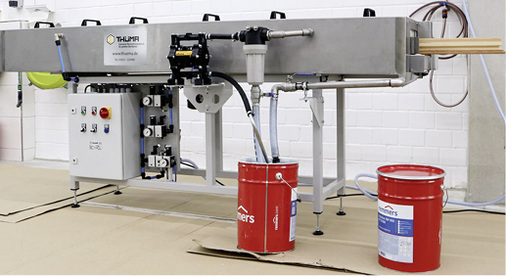 Kaiser – Betrachten wir einmal den Grundiervorgang. Normal ist es, den Fensterrahmen zu bauen, aufzuhängen und dann zu fluten. Jetzt besteht die Möglichkeit, dass am Einzelteil gefertigt wird – inklusive Imprägnierung, Zwischenschliff und Zwischenbeschichtung. Das ist ein berechtigter Trend, weil ja auch die Elemente immer größer und schwerer werden. Große Hebe-Schiebe-Anlagen in 6 m Länge hängt man nicht mehr einfach so an eine Traverse. Dazu haben wir hier von Range und Heine die erste Prototypenanlage der Einzelteilgrundieranlage flowcoroll G platziert und auch mit weiterentwickelt.