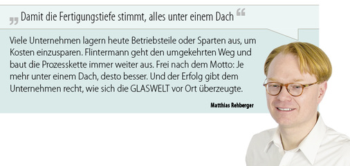 Die heimischen Kunden des Glasveredlers kommen aus unterschiedlichen Bereichen. Das Gros der Abnehmer sind Fassadenbauer, größere Bauunternehmen sowie Handel und Industrie (z. B. Möbelproduzenten) sowie auch die Automobilindustrie. Rund 40 Prozent sind mittlere bis große Handwerker, d. h. Metallbauer oder Holzverarbeiter. An Endkunden, sprich Häuslebauer, liefert Flintermann nicht.