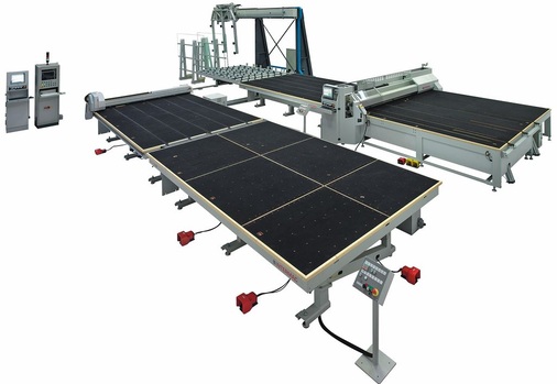 Im Bild rechts ist eine Kombination aus einer automatischen Scheibenzuführung und zwei Schneidanlagen, einem Genius 37 CT für den Zuschnitt von monolithischem Glas (für Scheiben bis 3800 x 2790 mm) und einem Genius 37 LM-S für laminierte Scheiben (maximale Schnittlänge 3760 mm) zu sehen.