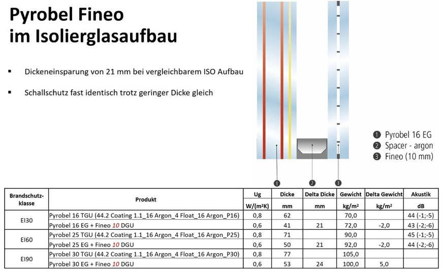 Im Vergleich zu konventionellen Brandschutz-Isolierverglasungen ist die Kombination aus Pyrobel und Fineo deutlich schlanker und leichter: So lässt sich eine klassische EI30-Verglasung mit 58 mm Aufbaudicke durch Pyrobel Fineo mit nur 26 mm Dicke umsetzen – bei identischem Feuerwiderstand und einem Ug-Wert von 0,7 W/(m²K).