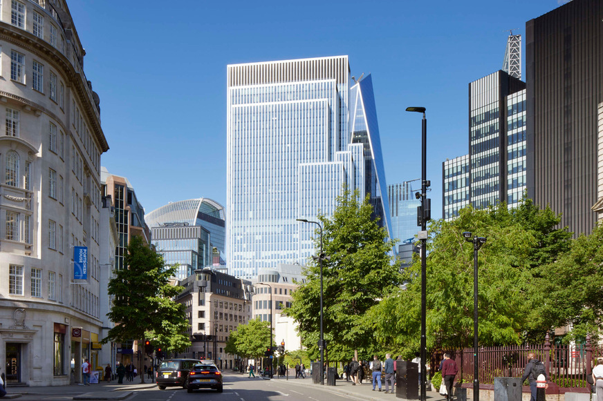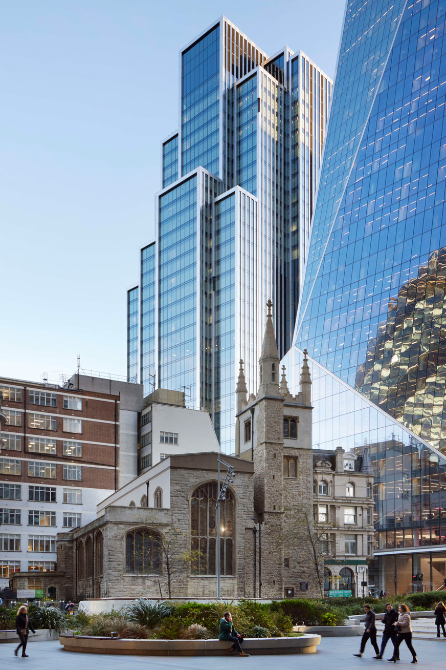 Der Entwurf von Make Architects ist mit zwei Türmen auf einem gemeinsamen Podium sehr elegant. Das Bauwerk ist in vertikalen „Slices“ angeordnet, die von 34 Stockwerken am Ende der Leadenhall Street auf 7 Stockwerke zur Themse hin abfallen.