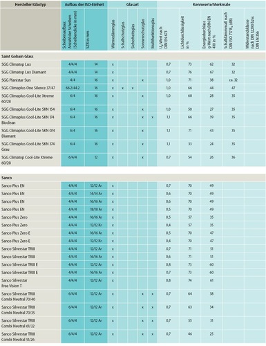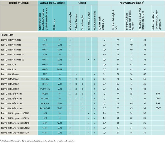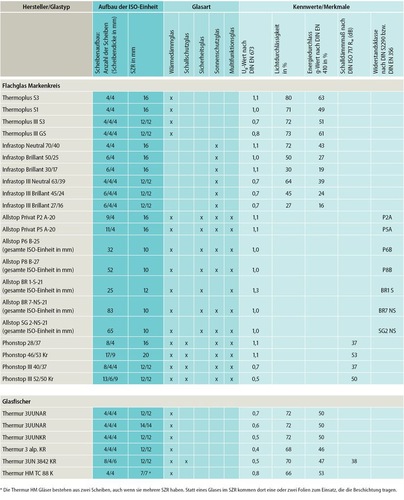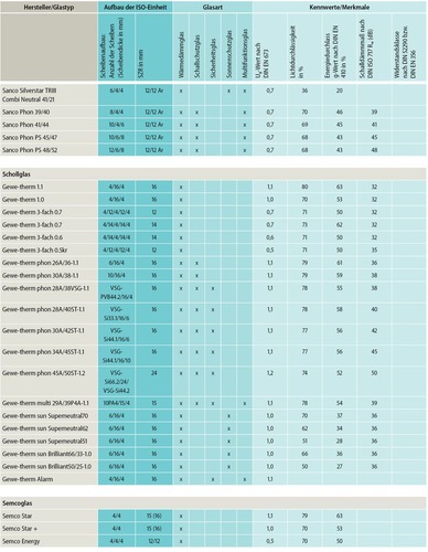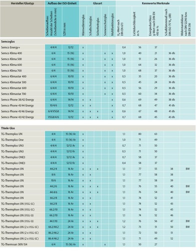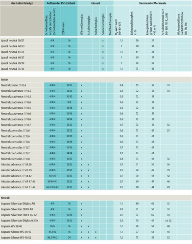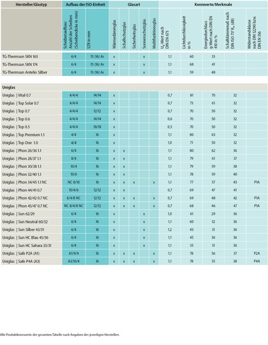 Um den steigenden Anforderungen an Wärme-, Schall- und Sonnenschutz gerecht zu werden, bieten die ISO-Produzenten heute eine große Auswahl an 2-fach- und 3-fach-Isoliergläsern an. Mit diesen Produkten lassen sich – je nach Aufbau – auch der Schutz vor Einbruch sowie Feuer- und Rauchschutz umsetzen. Nachfolgend zeigen wir in unserer Marktübersicht eine Auswahl an aktuellen Produkten, wobei das Sortiment der Anbieter weit umfassender ist, als hier dargestellt. Die nachfolgende Tabelle lässt sich im Downloadbereich unserer Microsite