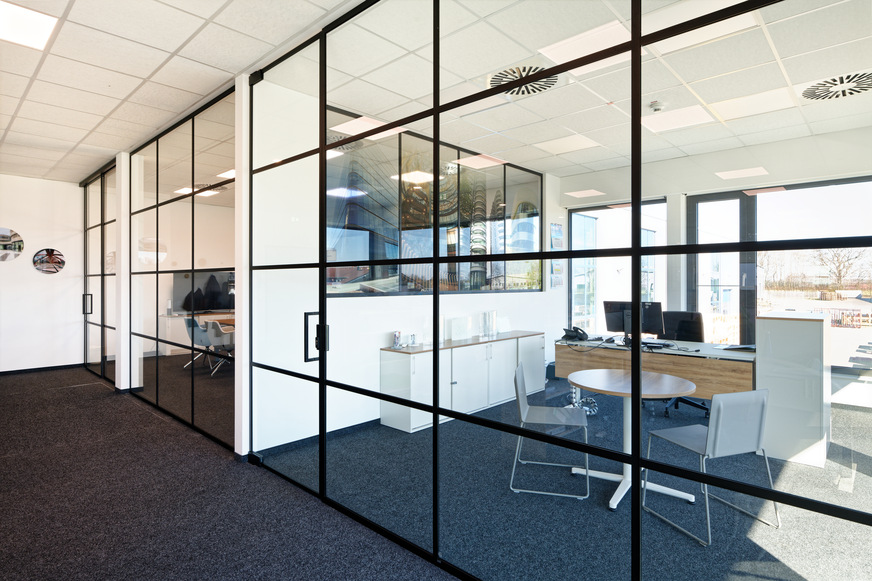 Der Faktor Tageslicht spielte bei der Projektplanung und bei der Auswahl der Verglasung im Büroneubau eine wesentliche Rolle. Dort kamen spezielle Semco-Klimaglas-Beschichtungen zum Einsatz, die für ganzjährige Behaglichkeit sorgen, um maximale Produktivität am Arbeitsplatz bei gleichzeitigem effektiven Klimaschutz zu erzielen.