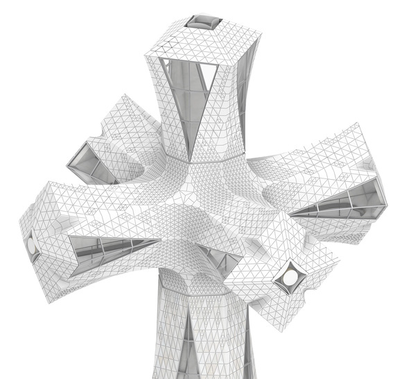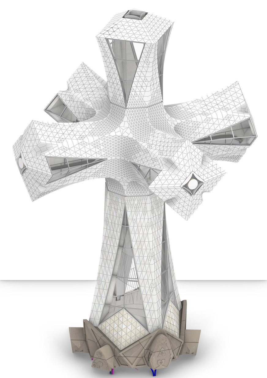 Die Konstruktion für das Kreuz besteht aus hochwertigem Edelstahl (Duplex), in das Ultra-Hochleistungsbeton (UHPC) vergossen wird Das Kreuz wird mit Steinen und Keramik verkleidet und mit transparenten und transluzenten Scheiben verglast, die teilweise gebogen und pyramidenförmig geformt sind.