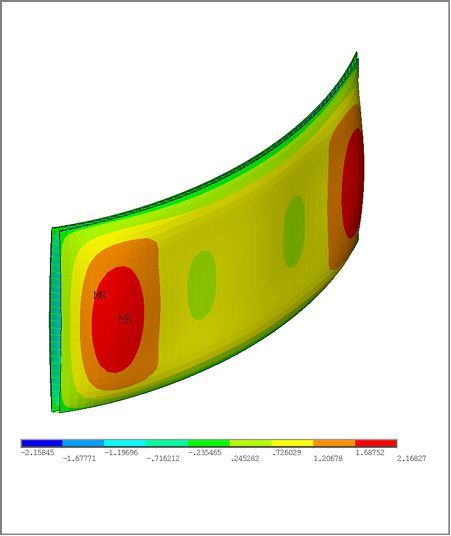 Ebenso sind die Auflagerkräfte auf die gekrümmten Ränder konzentriert, was bei der Bemessung der Befestigung berücksichtigt werden muss. Die größten Spannungen der Gläser konzentrieren sich ebenfalls auf den Bereich entlang der gekrümmten Ränder und sind hier i.A. deutlich größer als in der Scheibenmitte bzw. den parallel zur Zylinderachse verlaufenden, geraden Rändern.