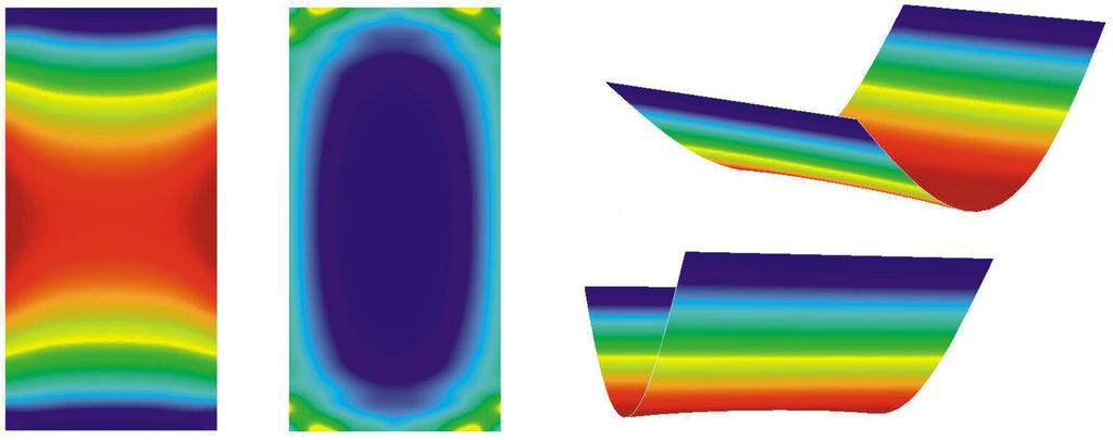 Zweiseitig gelagerte Platten erfahren aufgrund der Querdehnung ein geringes Einschüsseln der ungelagerten Plattenkanten, so wie es die Verformungsfiguren in Bild 1 zeigen. Man sieht, dass sich eine größere Kantendurchbiegung als Feldverformung der Platte ergibt. In Bild 1 ist links die Größere der Hauptspannungen an der Unterseite einer zweiseitig gelagerten Platte dargestellt. Erkennbar ist, dass sich die Hauptzugspannungen an den ungelagerten Kanten, also dem Ort der größten Durchbiegung konzentrieren (rot = Hauptzugspannung, blau = Hauptdruckspannung). Auf der Oberseite haben sich in den eckennahen Bereichen wiederum tangentiale Zugspannungen ausgebildet, die in gewisser Weise mit denen in vierseitig gelagerten Platten vergleichbar sind. Die weitaus größeren Spannungen treten jedoch etwa in der Feldmitte an den ungelagerten Kanten auf.