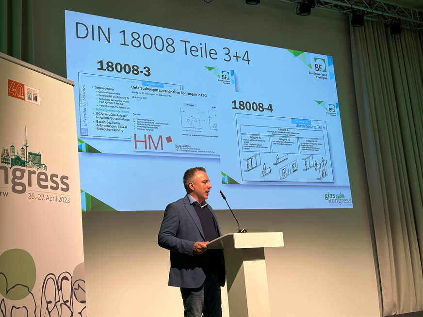 Weiter hielt Christian Müller, Architekt im Ingenieurbüro ARUP, einen Vortrag über „Erhalten, Ertüchtigen, Wiederverwenden und Verwerten von Glas“. Er stellte hierzu nachhaltige Strategien vor, um Glas wiederzuverwenden. Qualitätsstufen und -klassen können hier helfen, die Nachhaltigkeit von Glas zu verbessern.