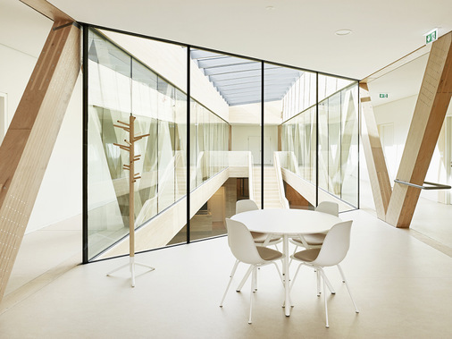 An Stellen, an denen die physikalischen Kräfte zu groß werden, wurden daher hybride Konstruktionen aus Holz und Stahl eingesetzt. Je nach Anforderungen an die Nutzung des Gebäudes wurde eine vielfältige Verwendung von Holzarten (Nadelholz, Buche) und Holzwerkstoffen (Vollholz, Brettschichtholz, Brettsperrholz, Furnierschichtholz) berücksichtigt. Das verwendete Holz stammt vorwiegend aus heimischen Wäldern.
