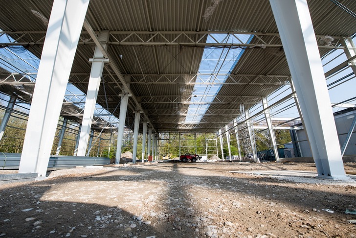 Die neue Halle ist aufgeteilt in drei Abschnitte. Goldbeck installiert im Sommer insgesamt vier riesige Kräne zum Transport der Glasscheiben, die als Rohling angeliefert und nach der Bearbeitung in einem der neuen und größeren Finiglas-Öfen in einem aufwendigen Prozess gebogen werden.