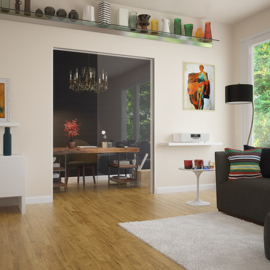 Die modifizierten Module aus dem Muto Programm erlauben einen Einbau der Laufschiene in einen Deckenschlitz und darüber hinaus ein Verfahren der Schiebetür in eine Wandtasche. So bleibt die Wand neben dem Durchgang frei für dekorative Gestaltung oder praktisches Mobiliar, ganz gleich ob in kleinen Wohnungen oder bei der flexiblen Trennung von Büros oder anderen Nutzungsflächen.