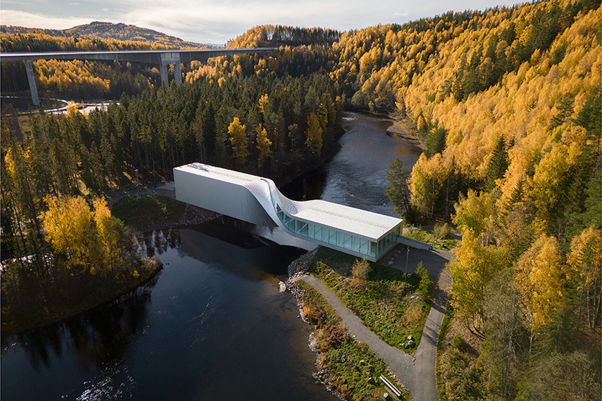 "The Twist" steht auf dem Gelände des Kistefos Kunstmuseums inmitten der norwegischen Waldlandschaft. Das Bauwerk schließt den Rundweg durch den Skulpturenpark oberhalb des Flusses Randselva. Die spektakuläre 90-Grad-Drehung verwandelt das Galerie-Gebäude selbst in eine Skulptur.