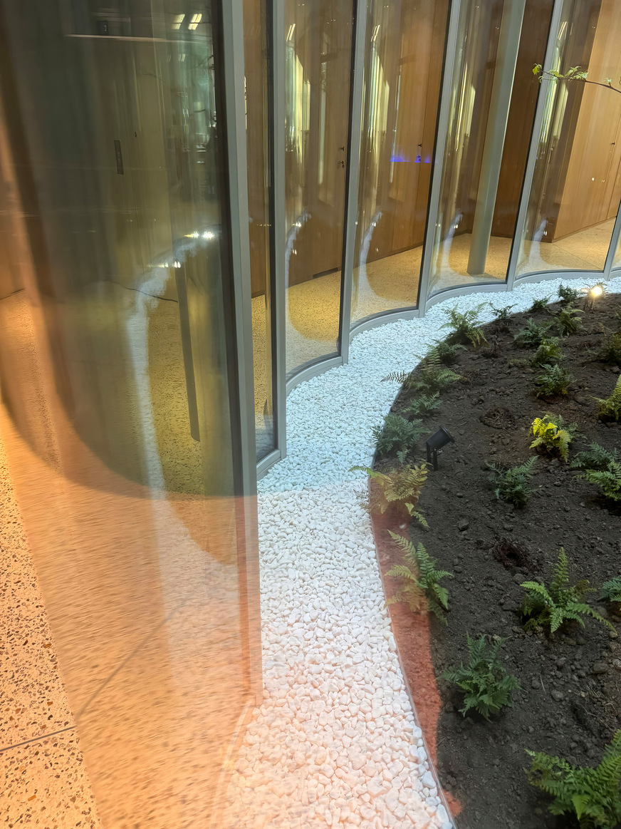 Auch die Montage stellte hohe Anforderungen. Die Installation der gebogenen Gläser in radialer Geometrie erforderte eine exakt abgestimmte Sequenz über alle Geschosse hinweg. Jedes Element musste in definierter Reihenfolge und Position eingebaut werden, da bereits kleinste Abweichungen Auswirkungen auf nachfolgende Elemente hatten.