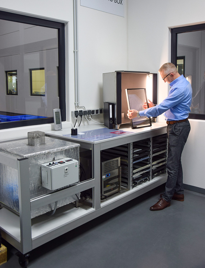 Abschließend werden die Prüfkörper in der Beobachtungseinrichtung aus 1 m Abstand mittels Durch- und Auflicht auf durch Fogging verursachte Interferenzen oder Streulicht untersucht. Die Prüfung nach DIN EN 1279- 4:2018, Anhang C, wird mit dem EK-Prüfzertifikat bestätigt.