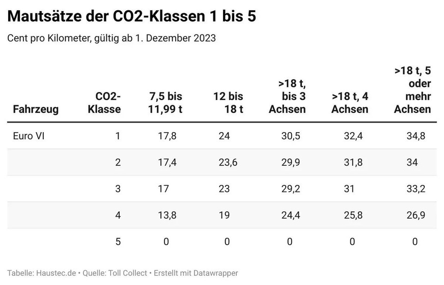 Seit dem 1. Dezember 2023 stuft Toll Collect Lkw in fünf Emissionsklassen ein, um nach CO2-Ausstoß zu differenzieren. Die sogenannte CO2-Maut ist ein Aufschlag auf die bisherige Lkw-Maut. Sie wird auf Basis des spezifischen Kohlendioxid-Ausstoßes des Lkw berechnet. Dieser Aufschlag beträgt 200 Euro pro Tonne CO2. Die Folge ist, dass Lkw künftig in eine der fünf Emissionsklassen fallen: