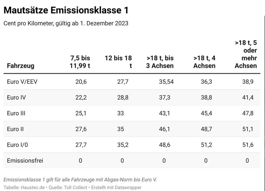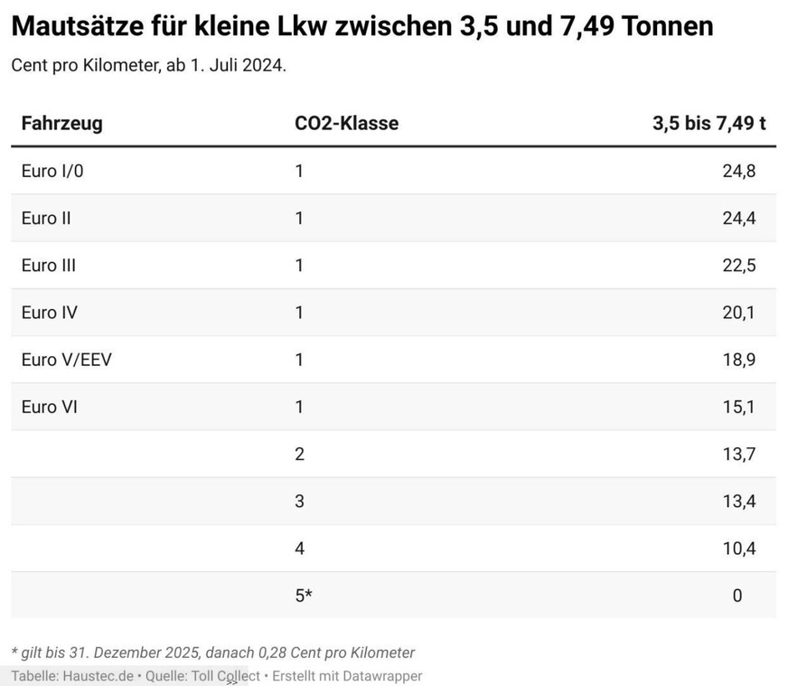 Ab 1. Juli 2024 fallen auch Lkw ab 3,5 Tonnen unter die Mautpflicht. Ihr Satz wird unter dem bisher geringsten Tarif liegen. Auch hier fallen alle Verbrenner bis Baujahr 2019 in Emissionsklasse 1 - unabhängig von der Abgasnorm. Je nach Abgasnorm - von Euro-Norm 1 (und schlechter) bis Euro-Norm VI - wird innerhalb dieser Emissionsklasse 1 noch einmal differenziert. Fahrzeuge mit Euro-Norm VI können mit entsprechenden Nachweisen, je nach spezifischem CO2-Ausstoß, in einer bessere und damit günstigere CO2-Klasse eingestuft werden.