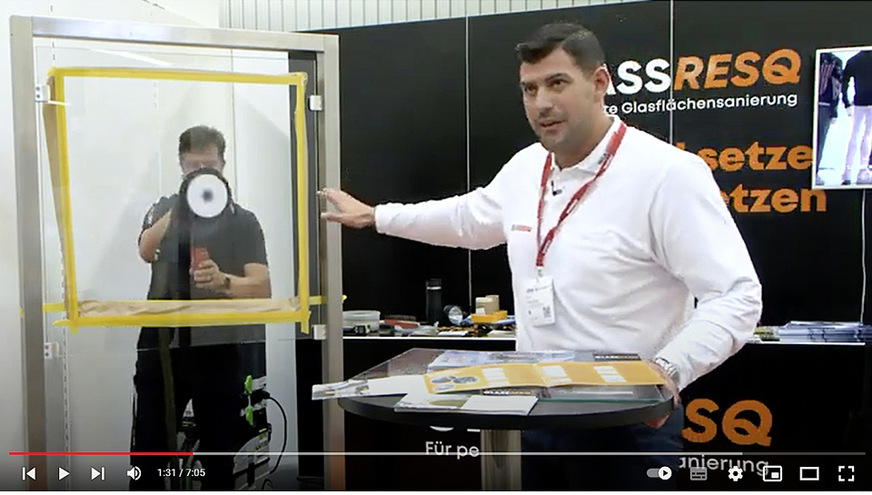 Hier im Bild Glassresq CEO Dominic Duer auf der Fensterbau Frontale 2022 in Nürnberg bei der Guided Tour der GLASWELT.