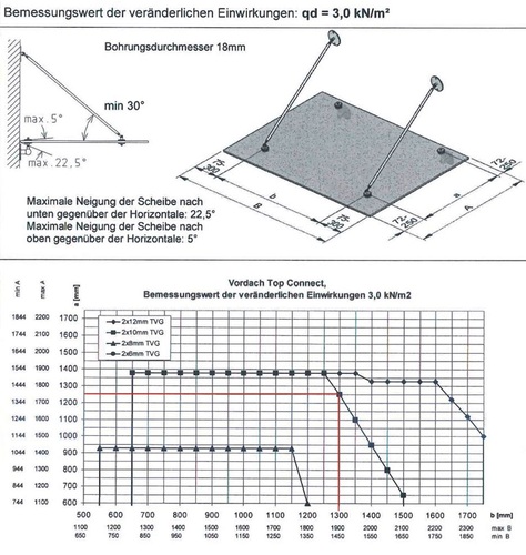 Ein Nachweis nach aktuellem bauaufsichtlich eingeführten Konzept der Teilsicherheitsbeiwerte ist sehr einfach möglich mit der Allgemeinen bauaufsichtlichen Zulassung Z-70.3-85 oder Z-70.3-74 und den darin enthaltenen Diagrammen (siehe unten). Für unser Beispiel ergibt sich ein Glasaufbau von 2 x 10 mm TVG.