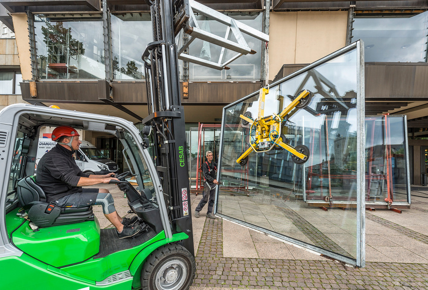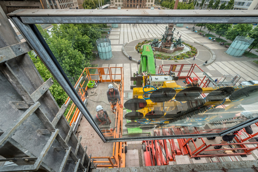 54 dieser Elemente sind 3,20 x 2,80 m groß und wiegen je rund 550 kg. Das sind gut 300 kg mehr als eine der alten Scheiben. Weitere 36 Glasscheiben verschiedener Größen wurden an den Rand- und Seitenbereichen der Fassade verbaut.