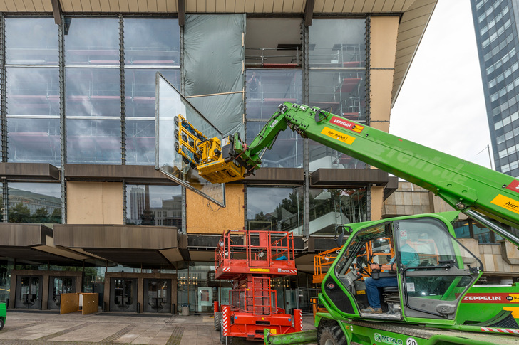 Der Austausch der Fassade war spektakulär und erfolgte mittels Hebebühnen und Lastkränen. Hierbei wurde jeweils ein senkrechter „Glasstreifen“ komplett herausgenommen und direkt mit den neuen Scheiben verschlossen.
