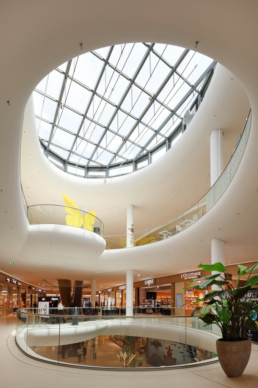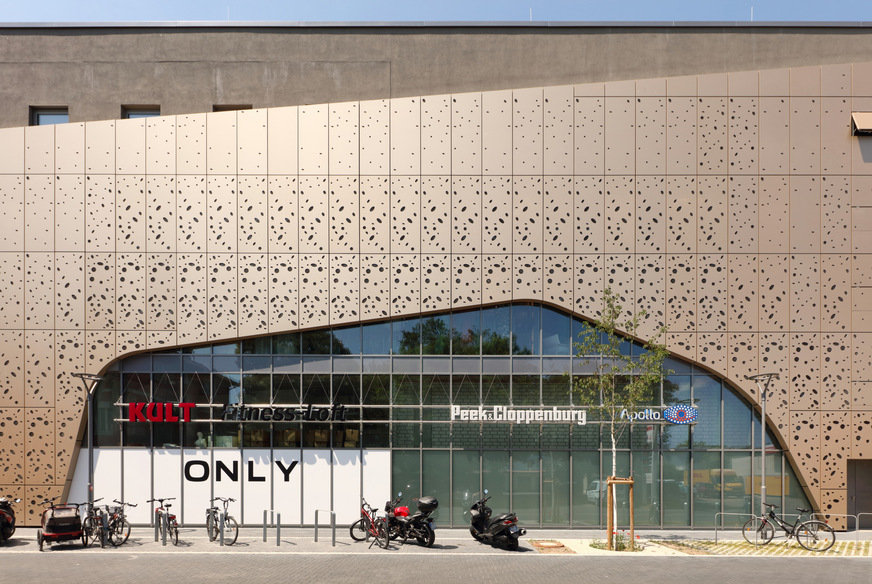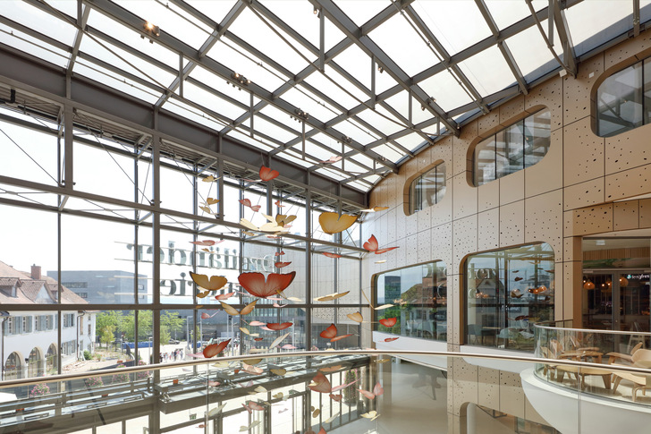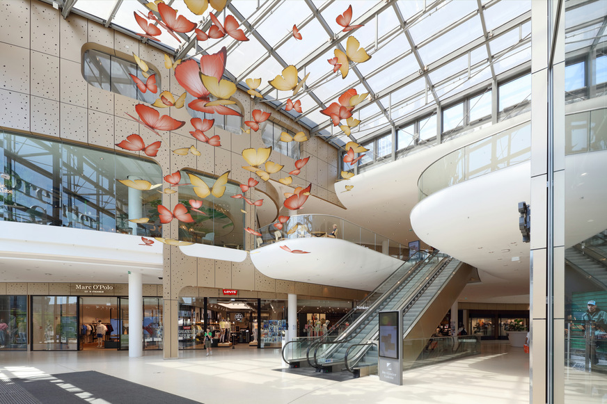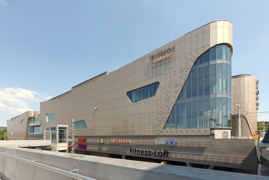 Die Dreiländergalerie direkt am Bahnhof von Weil am Rhein verfügt über 70 Shops und zahlreiche Gastronomiebetriebe. Architektonisch fallen sofort die organische Formgebung des Objekts und die metallisch schimmernde messingfarbene Fassade aus Aluminium und Glas. Dabei betont die zweischichtige Fassade optisch das geschwungene Gesamterscheinungsbild, das sich durch das gesamte Einkaufszentrum zieht.