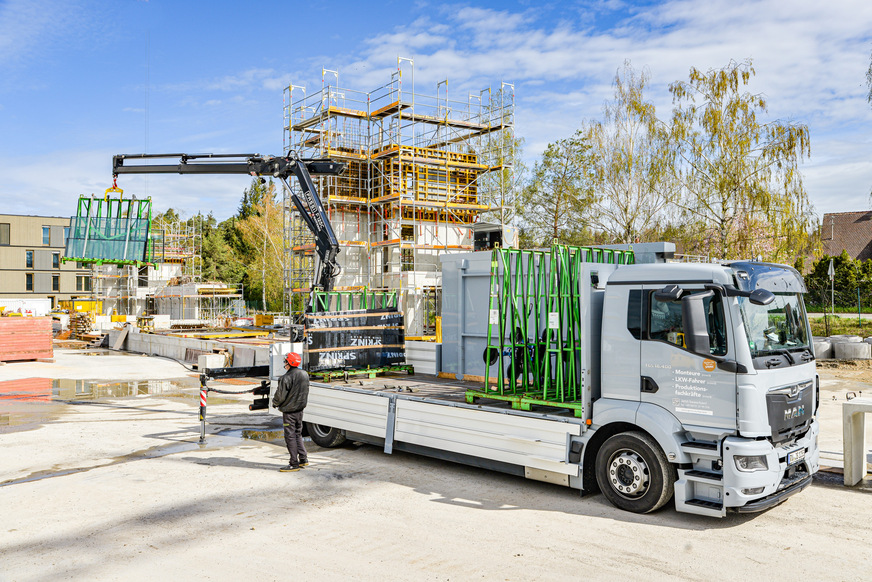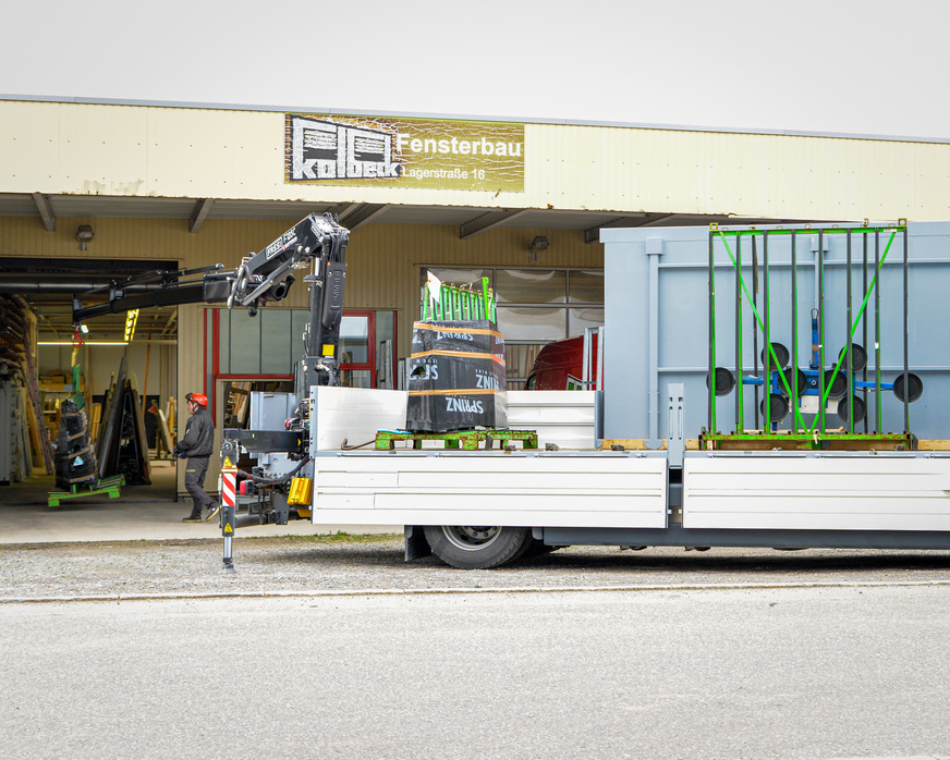 Dieser wurde von der Natterer GmbH geliefert und mit einem speziellen Pritschenaufbau für Glastransporte von der Gomm Fahrzeugbau GmbH ausgestattet. Die Empfehlung für den Fassi-Kran kam von der SLS Transport AG, einem erfahrenen Logistikpartner von Sprinz.