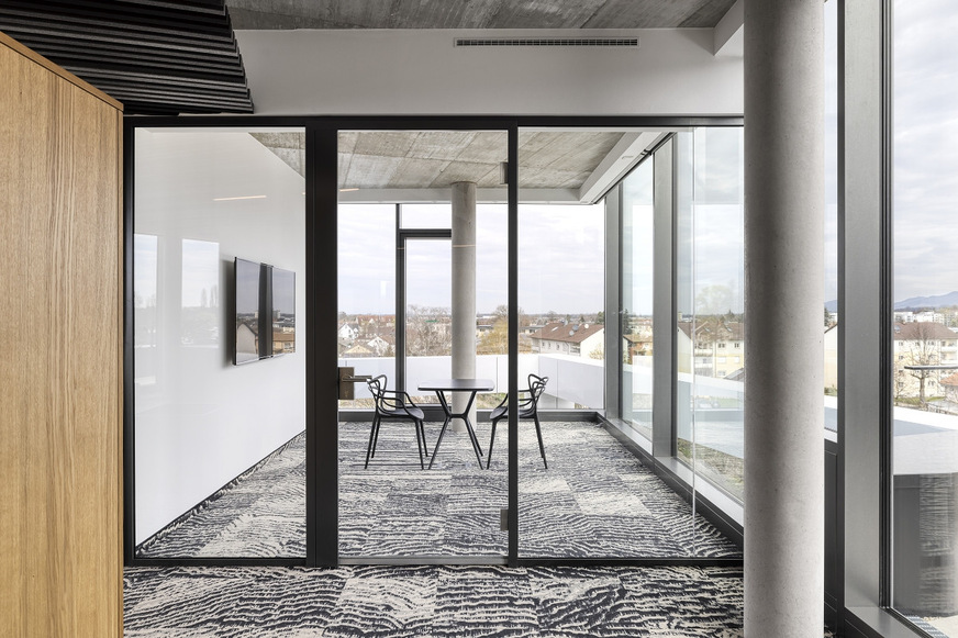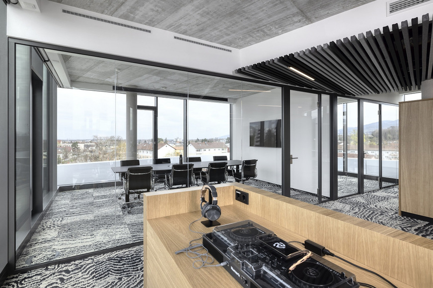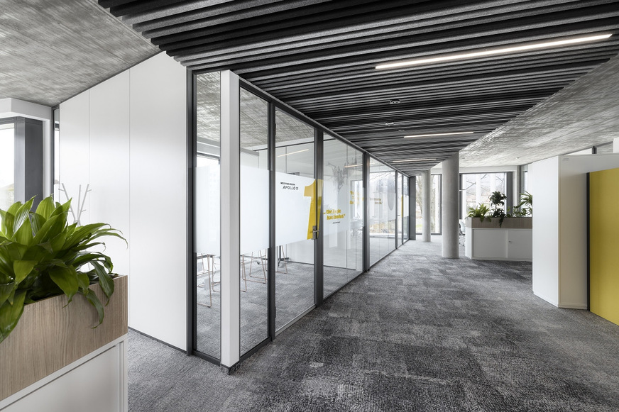 In den Büroetagen grenzen fecoplan-Glaswände mit 12 mm ESG und einem Schalldämmprüfwert von Rw,P = 37 dB mit Ganzglastüren fecotür G10 mit 32 dB die Besprechungsbereiche von den Teamflächen ab.