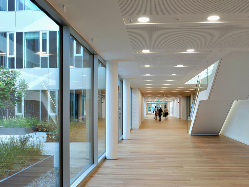 Transparente Brandschutzsysteme mit hochleistungsfähigen Brandschutzgläsern der Feuerwiderstandklasse EI 30 bilden Brand- und Rauchabschnitte in Eingangshalle und Atrium und bieten Schutz vor Feuerüberschlag.