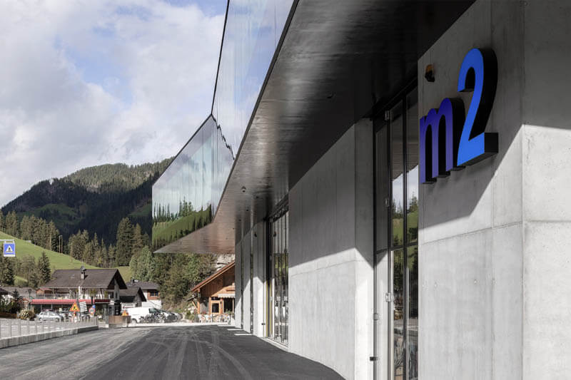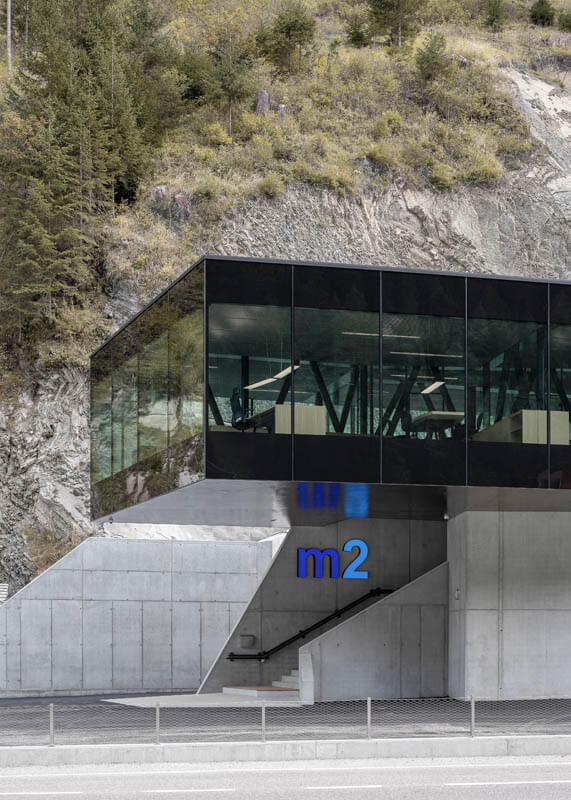 Eins mit der Natur: Anstatt baulich in die Natur einzugreifen, schmiegt sich der Bau der m2 Railgroup seitlich an den Berg, folgt in seiner Form den natürlichen Gegebenheiten: Auf den ersten Blick ist für den Betrachter der leichte Knick im Obergeschoss kaum wahrnehmbar, dennoch ist er vorhanden.