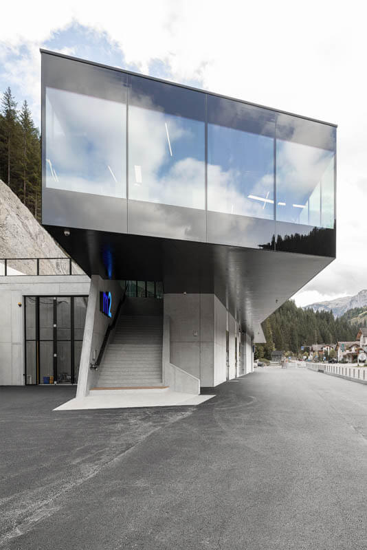 Die schwarze Farbe der Profile wurde auch im unteren und oberen Bereich des Fensterglases aufgenommen, um die Boden- und Deckenkonstruktion zu verbergen. Das Ergebnis ist ein Stockwerk komplett aus Glas. In der Außenfassade spiegeln sich Berge und Himmel – damit ist die scheinbare Verschmelzung von Außen- und Innenbereich komplett.