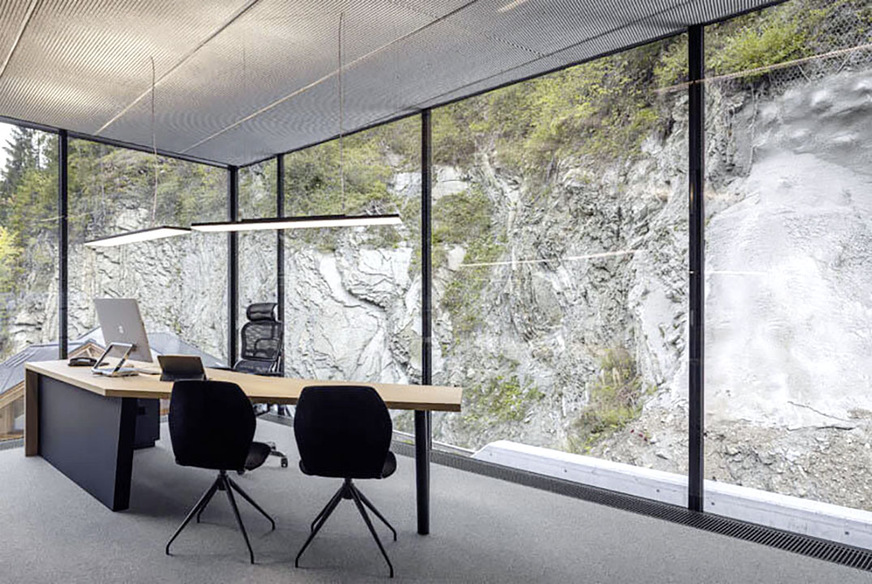 Die Büros im Obergeschoss bieten Ausblicke auf die steinige Felswand und die bewaldeten Hügel der Umgebung. Ihre Entsprechung findet die umgebende Natur in der Gestaltung der Räumlichkeiten im Inneren, die ganz in Erdtönen gehalten sind.