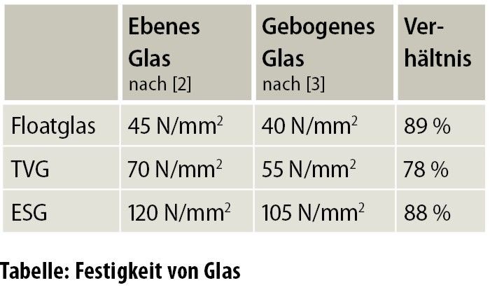 Um die Anwendung von gebogenem Glas auf eine breitere Basis zu stellen, wird gegenwärtig am Institut für Baukonstruktion der TU Dresden [1] die Festigkeit gebogener Gläser untersucht bzw. wie man diese ermitteln kann. Nach den gängigen Nachschlagewerken liegen die derzeit verwendeten Festigkeitswerte deutlich unter denen, die für Flachglas üblich sind, wie die Tabelle zeigt.