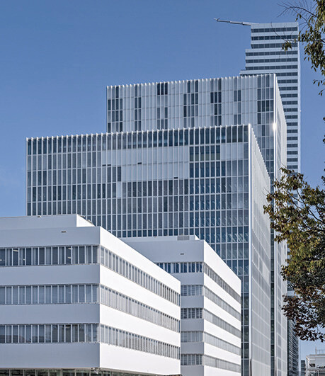 Die 5250 CCF-Elemente sind bis zu 5,5 m hoch und 1,36 m bzw. 1,45 m breit. Diese geschlossenen Elemente sind außen mit einer Prallscheibe aus VSG (Basis = Weißglas) sowie innen mit einem 3-fach-Isolierglas (Basis = Weißglas) mit jeweils einer Sonnen- und Wärmeschutzbeschichtung (Pos. 2 ipasol ultraselect 62/29; Pos. 5 iplus 1.1 von Interpane) verglast. Zwischen der äußeren und inneren Verglasung befinden sich in der Cavity 80er Flachlamellen als Sonnenschutz.