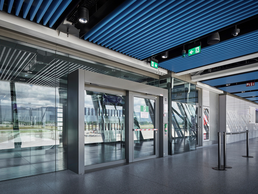 Diese so genannten Swing-Out-Türen wurden speziell für das Genfer Flughafenterminal entworfen und dimensioniert, um im Brandfall die optimalen Bedingungen für eine schnelle Flucht zu ermöglichen.