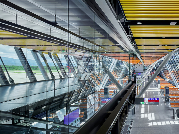Die Geometrie des Baukörpers, der im Querschnitt ein Parallelogramm darstellt, verleiht dem Terminalbau Leichtigkeit und Eleganz. Die geneigten Glasfassaden unterstreichen den schwebenden Charakter des Terminals und bieten den Passagieren freien Blick auf die Start- und Landebahn sowie auf die Bergkette des Jura.