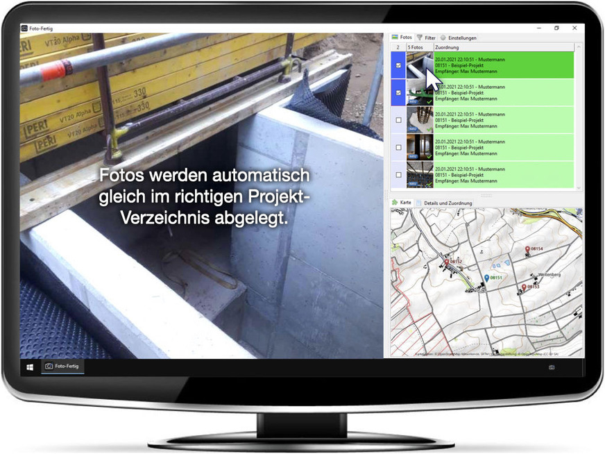 Die Benutzer der App müssen dabei sonst keinerlei Eingaben machen. Das erhöht die Akzeptanz des Systems bei den Monteuren und es animiert dazu auf der Baustelle mehr Fotos von der Baustellen, vom Baufortschritt sowie auch von vorgefundenen Fehlern und Mängeln zu machen. Die Foto-Fertig-Software im eigenen Betrieb nimmt die App-Daten entgegen, inklusive aller Fotos.