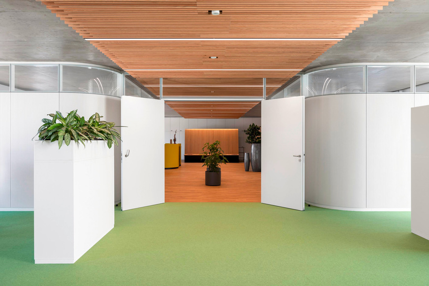 Der stützenfreie Raum ermöglicht, dass die Büroflächen in allen Möblierungsvarianten ausgeführt werden können. Vorhänge aus Wollfilz trennen bei Bedarf Gesprächsinseln in den offenen Teamflächen ab. Das Arbeitskonzept orientiert sich an den Ansätzen von New Work. Die Open-Space-Arbeitswelten ermöglichen ganz neue Arbeitsweisen, besser vernetzte Unternehmensbereiche und eine Stärkung des Gemeinschaftsgefühls.