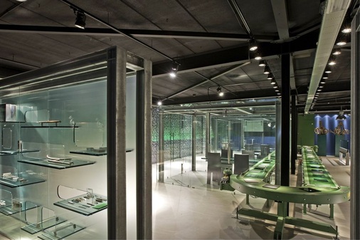 Will man die Ausstellung von Van Dijken Glas betreten, gleitet wie von Geisterhand eine große Glastür lautlos zur Seite und gibt den Weg in einen Raum frei, der sich als eine Mischung aus Galerie und Fabrikhalle präsentiert. Neben ansprechend ausgestelltem Glas und hochwertigen Beschlägen findet man in der Ausstellung auch ein Förderband, das die vielen gläsernen Handexponate transportiert. Dazu Gert-Jan van Dijken: „Eine unserer wichtigsten Zielgruppen sind Architekten. Und für diese habe ich unseren Showroom in erster Linie konzipiert. Hier kann ich im Detail zeigen, was mit Glas alles machbar ist. Darüber hinaus lieben Architekten das Fabrikambiente und fühlen sich so von der Ausstellungskonzeption angesprochen. “