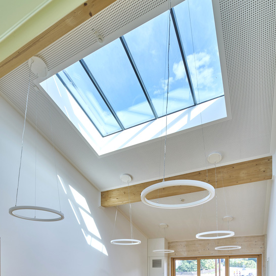 Aufgrund der doppelten Nutzung durch Kinderkrippe und VHS galten besondere Anforderungen an den Brandschutz. Die Glasolux-Oberlichter wurden daher auf der Unterseite mit speziellen Brandschutzgläsern versehen. Gleichzeitig entspricht der gesamte Bau den Standards eines KfW-40-Effizienzhauses. Eine Pellet-Heizanlage ergänzt die PV-Anlage, sodass das Gebäude einen minimalen CO₂-Fußabdruck aufweist.