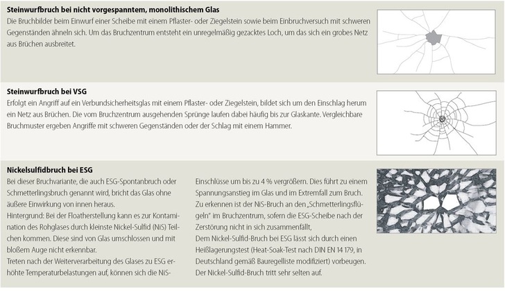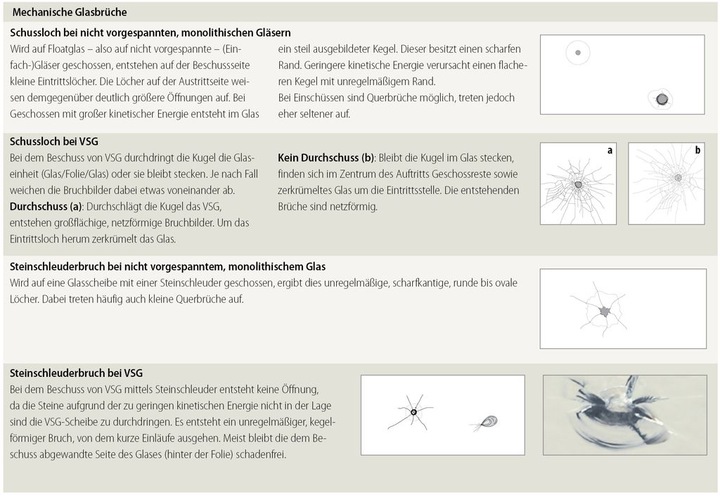 Bei Zerstörungen der Glasoberfläche durch Steinwurf ergeben sich aufgrund der geringeren kinetischen Energieeinträge hingegen ganz andere Bruch- oder Zerstörungsbilder (z.B. Abplatzungen).