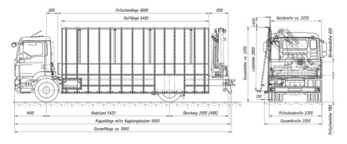Die Nutzlast liegt mit dem Aufbau bei 7125 kg (und ohne Reff bei 7605 kg). Als Ladekran dient ein Palfinger-Modell aus der High Performance-Baureihe mit einer Reichweite von 9,90 m.